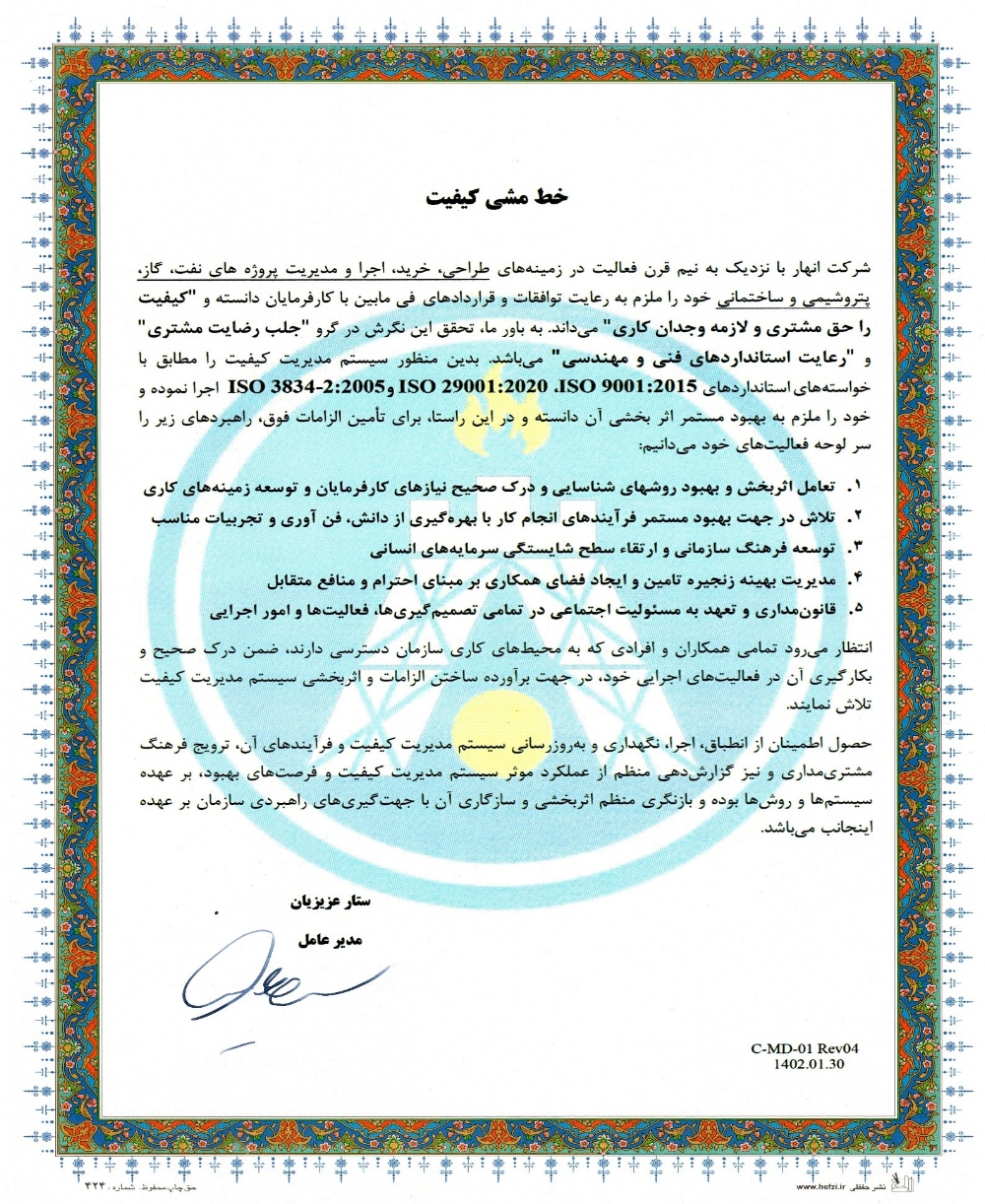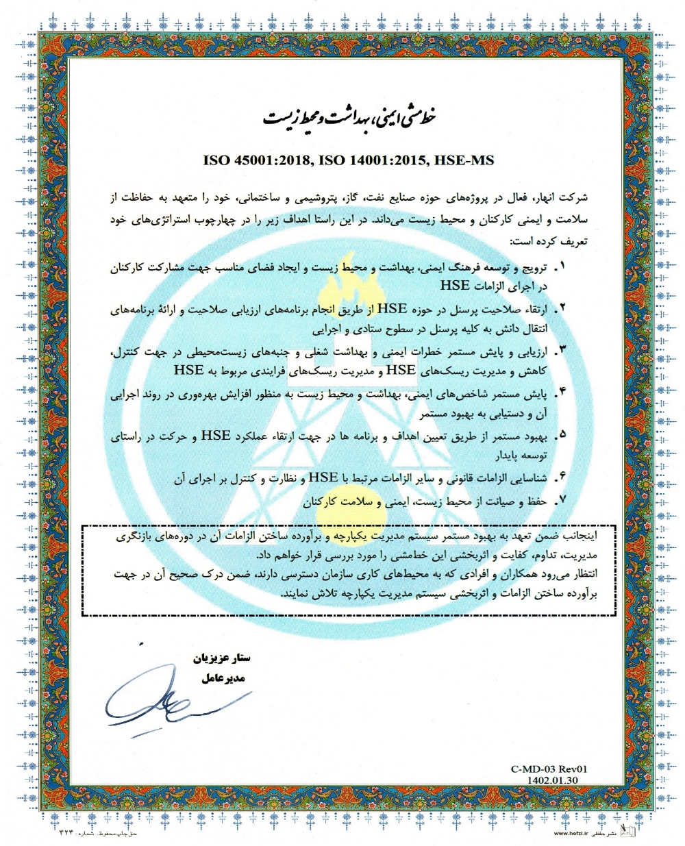 اینجانب ضمن تعهد به بهبود مستمر سیستم مدیریت یکپارچه و برآورده ساختن الزامات آن در دوره های بازنگری مدیریت تداوم کفایت و اثربخشی این خط مشی را مورد بررسی قرار خواهم داد.